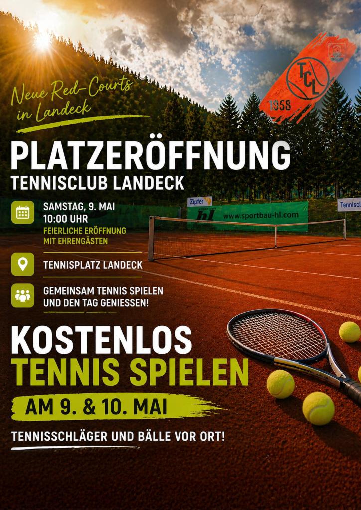 Da von diesen Tennisplätzen ein Teil neu gebaut worden ist, veranstalten wir am Samstag, den 09. Mai 2026, eine feierliche Eröffnung und Einweihung unserer neuen Red-Court-Plätze. Wir haben einige Ehrengäste eingeladen und werden euch mit Getränken und Snacks verwöhnen. Außerdem wollen wir euch unsere neue Anlage vorstellen und dürfen euch ganz herzlich einladen, den Tag auf unseren neuen Plätzen zu verbringen. Eingeladen sind natürlich all unsere Mitglieder aber auch alle Freunde des TC Landeck, ganz egal, ob ihr schon einmal Tennis gespielt habt oder nicht. Ihr dürft unseren geliebten Sport auch gerne einmal ausprobieren. Gäste dürfen das ganze Wochenende gratis auf unserer Anlage spielen. Wir stellen auch Tennisschläger und Bälle bereit! Kommt also gerne vorbei, bewundert unsere neuen Tennisplätze und feiert mit uns den neuen Abschnitt unseres Tennisclubs!