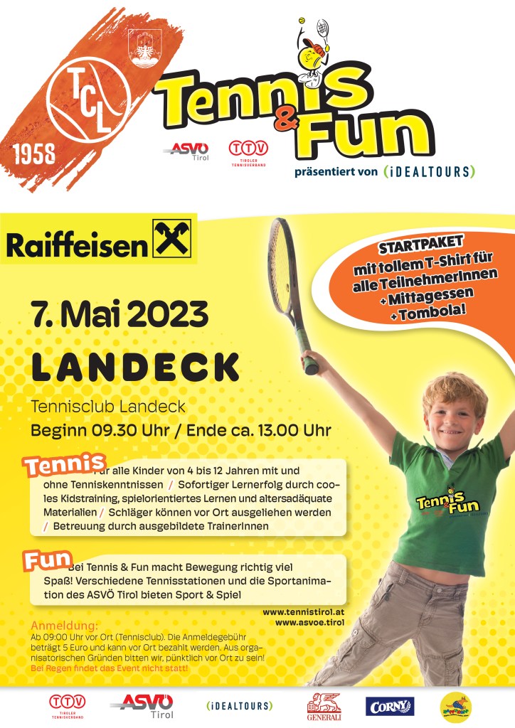 Auch in diesem Jahr stehen einige unterhaltsame Veranstaltungen auf dem Terminplan des TC Landeck. Den Anfang macht dabei Tennis & Fun. Schon in ein paar Wochen laden wir alle Kinder im Alter von 4 – 12 Jahren auf unsere schöne Anlage ein. Mit der Unterstützung des TTV, des ASVÖ Tirol und vielen Sponsoren bieten wir allen Tennis interessierten Kindern ein lustiges Programm, bei dem ihr unseren Sport spielend kennenlernen könnt. Eine Tombola mit coolen Preisen gibt es auch noch. Eine Voranmeldung ist nicht notwendig! Nähere Infos findet ihr auf dem Flyer.